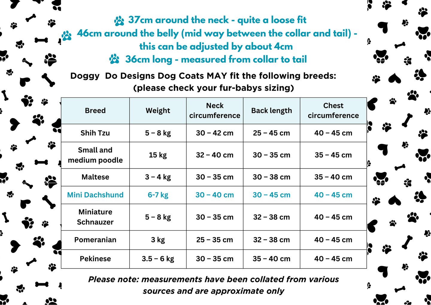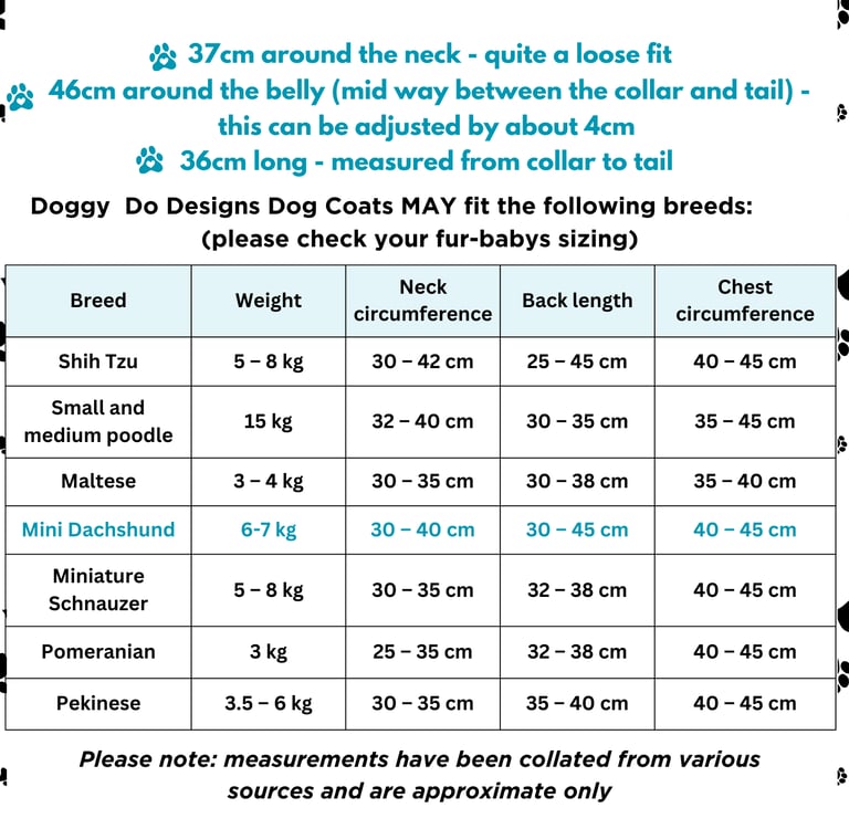Doggy Do Designs Coat Measurements (approximate)